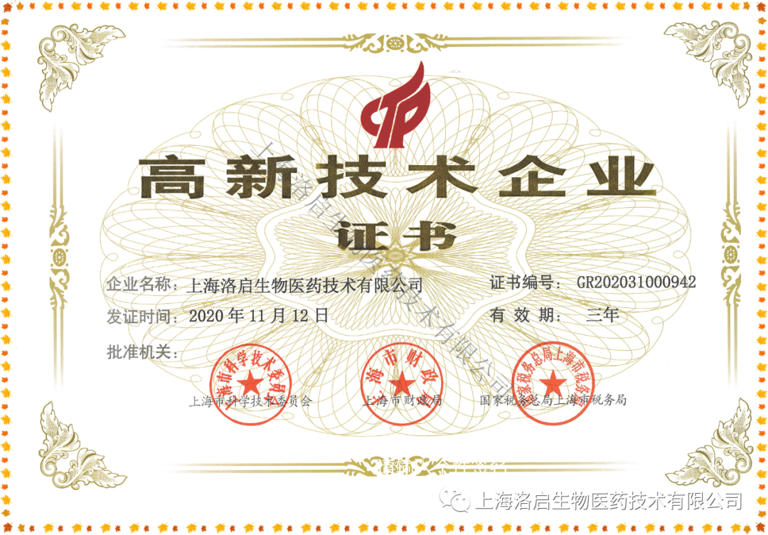 近期,上海mile米乐集团生物医药技术有限公司取得了由上海市科学技术委员会、上海市财政局、国家税务总局上海市税务局联合颁发的“高新技术企业证书”。